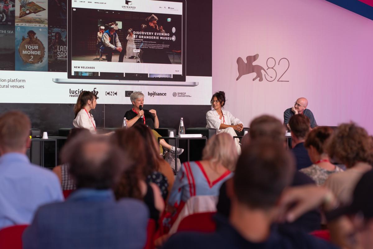 In der anschließenden Diskussion unter der Moderation von Deborah Reinmüller, Projektkoordinatorin für immersive Medien bei MOIN, stellte ein rein europäisches Panel verschiedene Modelle für den Vertrieb von immersiven Medien vor. Chloé Jarry von Unframed Collection und Agata Di Tommaso von Diversion waren sich einig, dass die ersten Orte für eine Demonstration Museen und Festivals sowie Galerien und weitere Kulturstätten sind. Für eine größere Verbreitung ist dabei ein Netzwerk von Abspielstätten notwendig, die über notwendigen technischen Bedingungen/Voraussetzungen verfügen müssen. Die Plattformen bieten Fortbildungen und umfangreiche Logistik an, um mögliche Orten, die Präsentation von immersiver Kunst zu ermöglichen. Darüber hinaus ist die Vermittlung zwischen Künstlern und Publikum, das immer noch mit der neuen Technologie vertraut gemacht werden muss, immens wichtig. Ein weiterer Ort für VR Experiences sind die Kinos. Diversion bietet einem von ihnen gebildeten Netzwerk von Kinos kuratierte Programme für eine feste Reihe an, um den Kinos keine extra Arbeit zu machen. Weitere und permanente Abspielstätten für immersive Projekte zu finden, ist eine großer Herausforderung für die Anbieter.